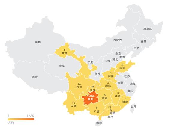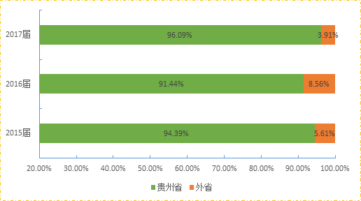 2017届毕业生基本来自贵州本省,还分布在贵州相邻省份及附近省份,外省中四川省、重庆市的人数在20人以上,其余的省份人数较少,详见下图。