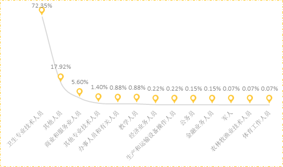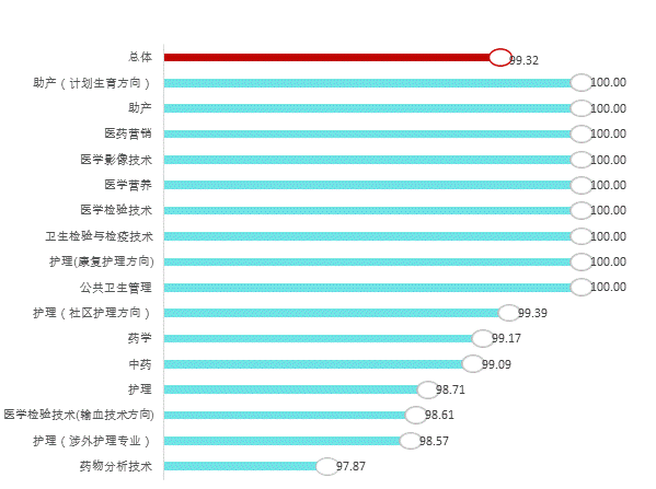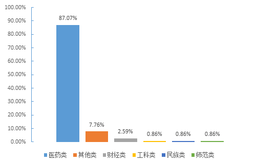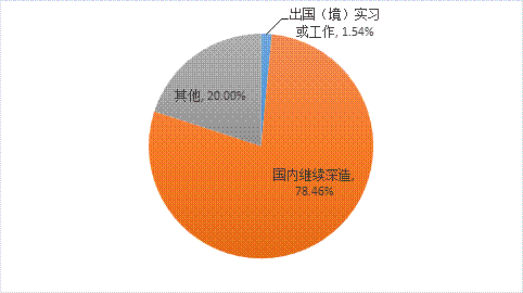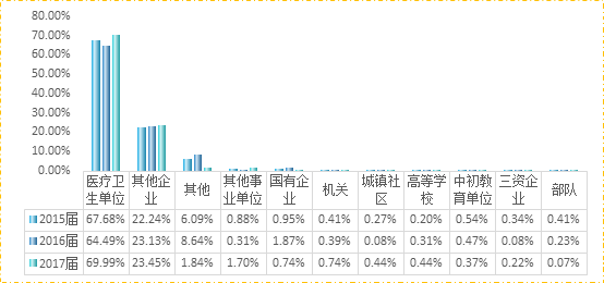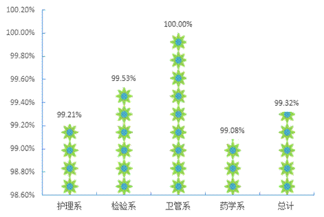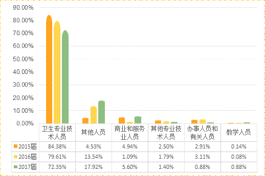 根据调研数据显示,学校2017届有毕业生1764人,就业率高达99.32%,在当前我国就业环境的冲击下仍能保持该就业率,说明学校在人才培养与就业工作方面均有亮点。分院系来看,学校各院系就业率均在99.00%以上,说明学校在人才培养上没有短板,各专业的学术与专业水平都有保障。调研统计中,学校毕业生近70.00%都就业于医疗卫生单位,有高达87.32%的毕业生在卫生和社会工作行业,这一就业趋势完全符合学校的人才培养特色,是学校鲜明特色得以树立的现实根基。从生源及就业地域来看,学校2017届毕业生基本上都来自贵州本省,就业地也以贵州省为主,其余省份的人数分布均在10人以下,说明学校当前仍专注服务本省医疗卫生事业的发展。