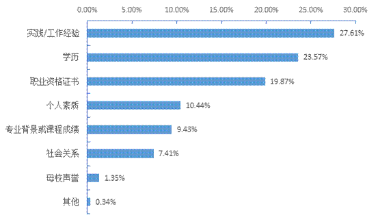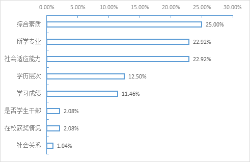 用人单位招聘毕业生所关注的因素中,综合素质占比最高,其次是所学的专业和社会适应能力。