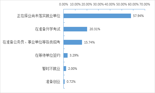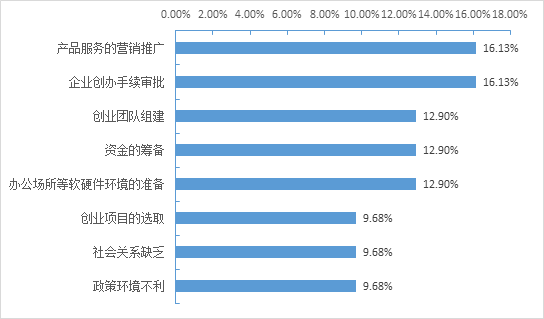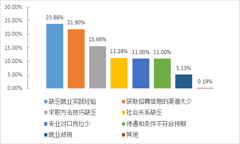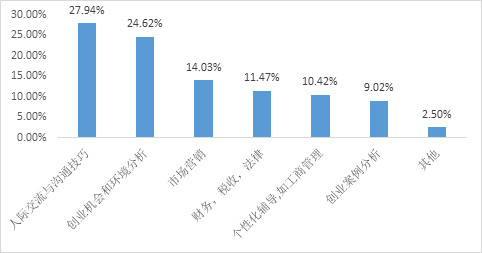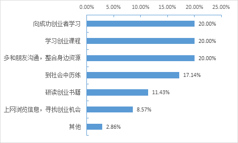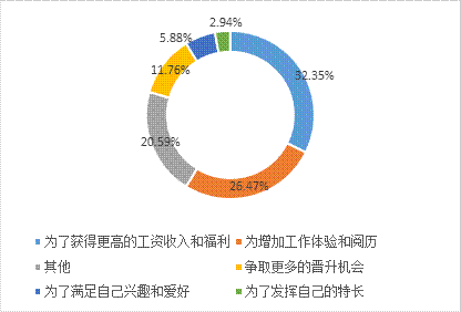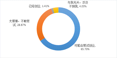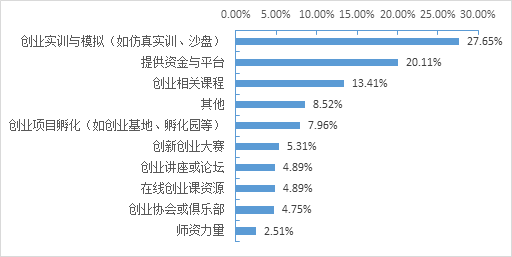 在就业市场对自主创业的呼唤下,学校当前的自主创业率并不很高,这与学校人才培养专业方向有关。但有65.70%的毕业生表示可能会尝试创业,而选择创业的毕业生中,64.29%的毕业生选择自主创业的原因是“希望通过创业实现个人理想”,具有一定自主自发性。而在创业过程中,最主要困难是产品服务的营销推广和企业创办手续审批,这说明学校在创业教育方面仍需加强,在具体创业能力与流程上对创业学生进行强化,帮助选择创业的毕业生能够在创业市场上闯出一片天。关于学校未来创业教育工作的开展,学生认为,创业实训与模拟(如仿真实训、沙盘)(27.65%)和提供资金与平台(20.11%)最为重要。