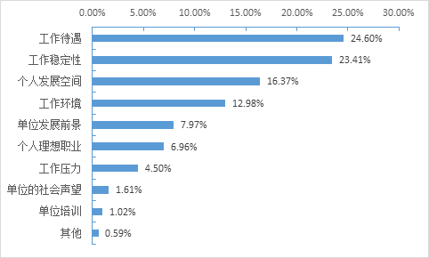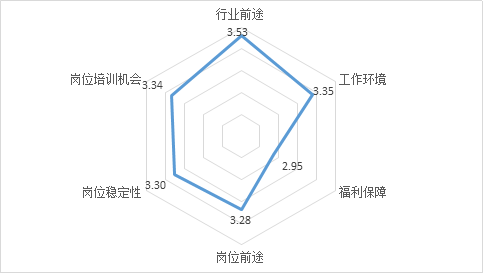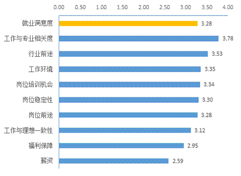 在对就业质量的总体评价中,根据就业质量指标模型可知,学生满意度评分区间为[3.2,3.28](满分五分),各指标中,工作与理想一致性、福利和社会保障、薪资满意度的指标重要性较高,但满意度低于平均水平,需要学校在未来的就业工作中做出针对性规划。根据调研可知,2017届毕业生认为影响就业的因素中实践/工作经验最重要,50.86%的已落实单位毕业生表示求职方式为通过自己直接联系应聘(参加社会公考、直接联系单位),通过母校推荐的仅占14.66%。当前整体就业质量方面,提供了基本保障(五险)或其他的占比达到61.21%,工作与专业相关度达到88.79%,所从事工作与理想一致性达到70.69%,70.69%的毕业生没有变动过工作。