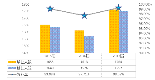 根据报告显示,学校2017届毕业生共有1764人,截至2017年8月31日,2017届毕业生就业率为99.32%,就业率水平很高。