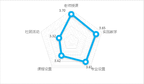 将毕业生对学校人才培养的满意度进行量化赋值,非常满意=5分、满意=4分、比较满意=3分、不太满意=2分、很不满意=1分,计算各指标平均值。毕业生对老师授课评价最高,为3.70分,其次是实践教学(3.65分),第三是专业设置(3.61分)。