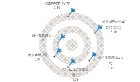 就毕业生对学校就业指导和服务的满意度进行量化赋值,非常满意=5分、满意=4分、比较满意=3分、不太满意=2分、很不满意=1分,计算各指标平均值。毕业生对校园招聘活动安排的满意度最高,为3.50分,其次是就业指导/创业教育课与服务(3.49分),第三是就业信息提供与发布(3.44分)。