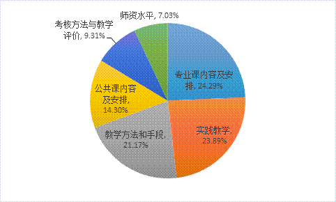 毕业生希望学校人才培养方面进一步改进的有以下几点:首先是专业课内容及安排(24.29%),其次是实践教学(23.89%),第三是教学方法和手段(21.17%)。