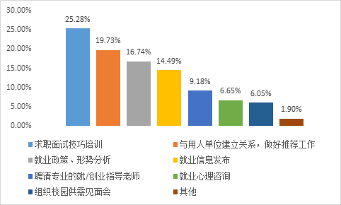 毕业生希望学校就业指导和服务加强的主要有以下几点:首先是求职面试技巧培训(25.28%),其次是与用人单位建立关系,做好推荐工作(19.73%),第三是就业政策、形势分析(16.74%)。
