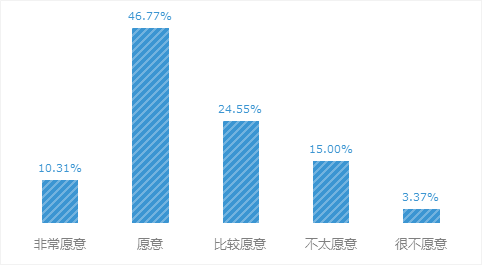 毕业生对学校的推荐度为 81.63%,包括非常愿意(10.31%),愿意(46.77%)和比较愿意(24.55%)。