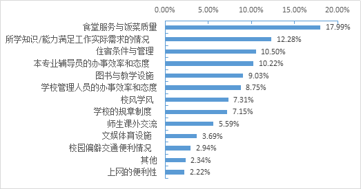 影响毕业生对学校满意度的最主要因素是食堂服务与饭菜质量(17.99%),其次是所学知识/能力满足工作实际需求的情况(12.28%),第三是住宿条件与管理(10.50%)。此外还有本专业辅导员的办事效率和态度,图书与教学设施,学校管理人员的办事效率和态度等也是影响毕业生对学校满意度的因素。