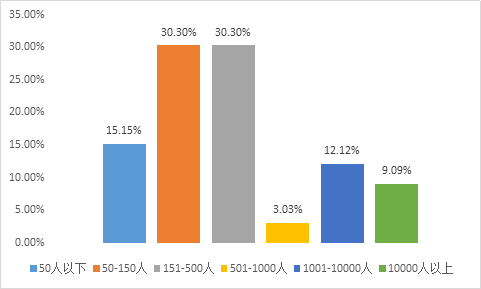 由下图可知,毕业生所在用人单位大多数为500人以下的中小型企业,其中,50人以下的占15.15%,50-150人及150-500人占比均为30.30%。