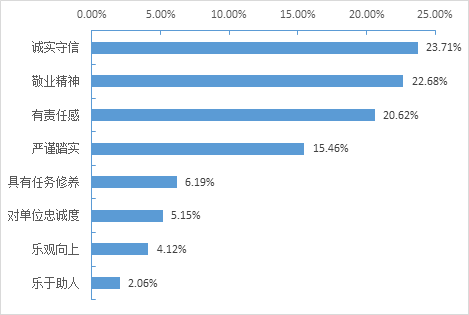 医学护理类用人单位注重的毕业生品质中,诚实守信(23.71%)占比最高,其次是敬业精神(22.68%)和有责任感(20.62%)。