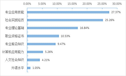 调研显示,用人单位较为看重专业应用技能、社会实践经历和专业理论基础。选择专业应用技能的占27.37%,这与学校的专业特色需求相一致。