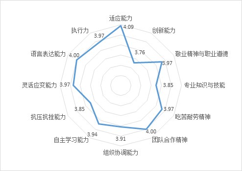 用人单位对毕业生各项能力和素质评价均较高,相对来说,创新能力、抗压抗挫能力和专业知识与技能的得分较低,一方面说明用人单位对这三项能力与素质的期望较高,一方面说明学校需对学生加强这几方面能力与素质的培养。