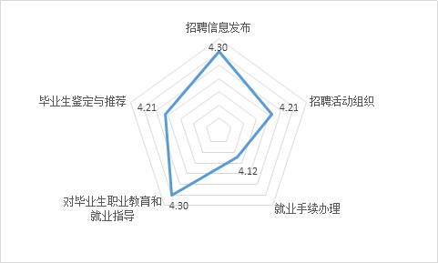 用人单位对学校就业工作的评价中,5项工作得分均在4分以上,其中招聘信息发布与对毕业生职业教育和就业指导的这两项工作得分最高,达4.30分。