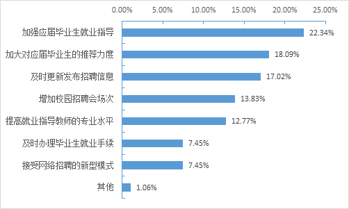 调研显示,用人单位对学校就业工作的建议中加强应届毕业生就业指导(22.34%)、加大对应届毕业生的推荐力度(18.09%)和及时更新发布招聘信息(17.02%)是被提及较多的几项。