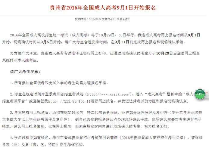 考试时间为10月中旬,成人高校招生统一考试,具体时间由省招生考试院另行通知。我市的全国成人高考由贵阳市教育局考试院统一组织和安排。考试科目请参照成人高等教育考试科目一览表。录取分数线由贵州省教育考试院划定,我校遵循从高分至低分的录取原则。